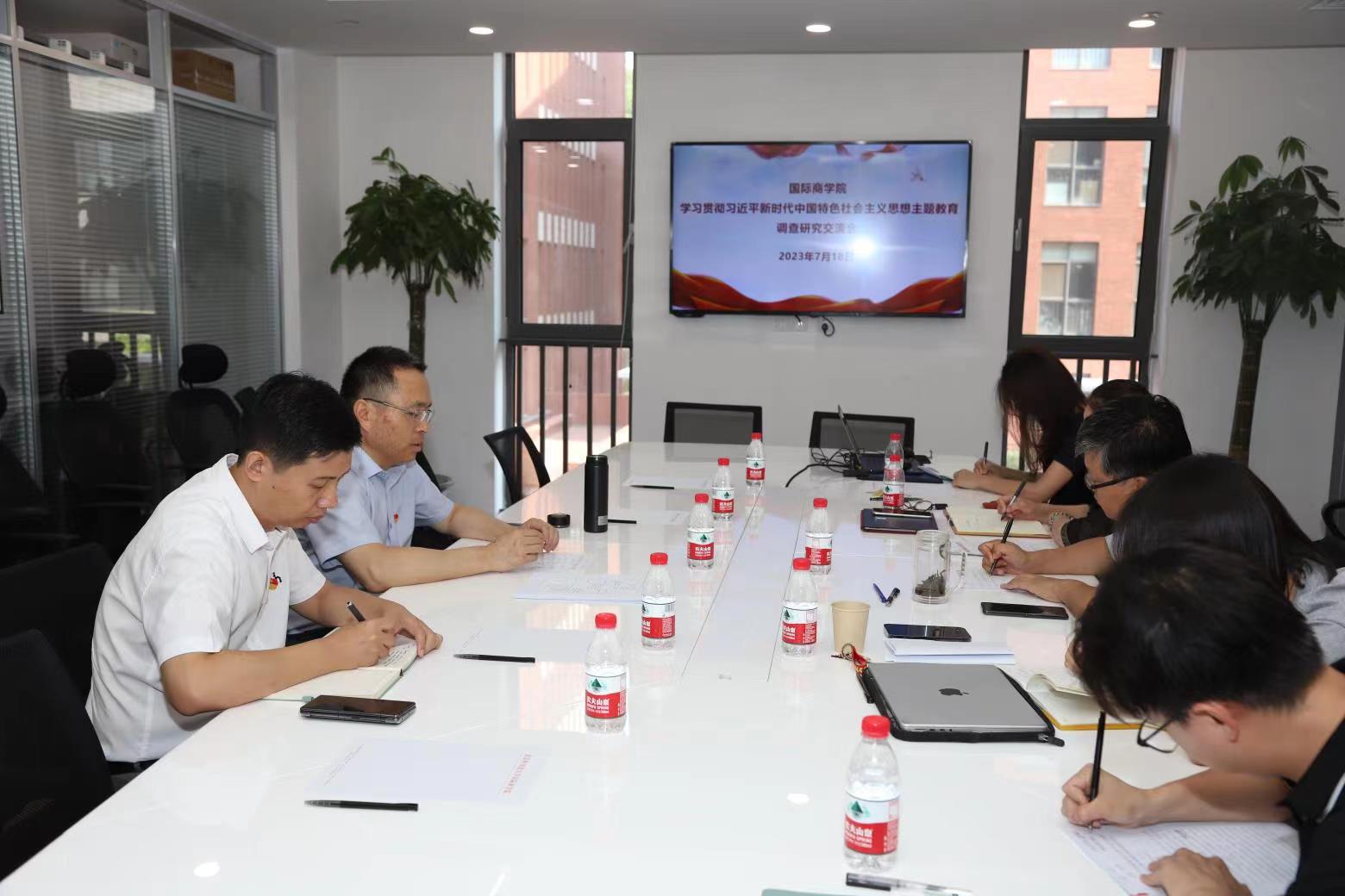 7月18日,学校党委副书记、校长杨丹,党办校办主任郑大鹏前往太阳成集团tyc234cc[主页]网址,听取太阳成集团tyc234cc[主页]网址领导班子关于主题教育调研成果汇报,进行深入座谈交流。太阳成集团tyc234cc[主页]网址党总支书记李春丽首先介绍了学院在主题教育开展过程中的特色和亮点工作,随后院长牛华勇,副院长宋泽宁、邵明星,党委组织员李文斌分别围绕个人调查研究进行了汇报。