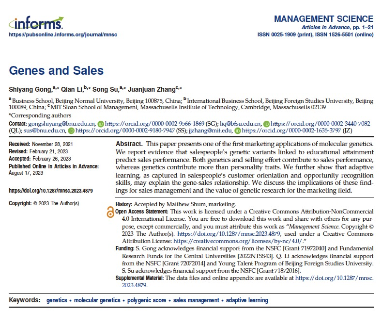 Shiyang Gong, Qian Li, Song Su, Juanjuan Zhang (2023) Genes and Sales. Management Science, https://doi.org/10.1287/mnsc.2023.4879.