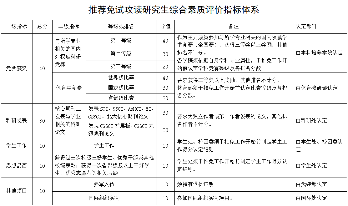 1、推免生学术专长原则上仅限学生本科阶段在核心期刊上以独立作者或第一作者发表的与学业相关的科研论文;作为主力成员参加与学业相关的国内权威科研竞赛(全国赛)并获得三等奖以上奖励(国际赛事参照执行,但不得低于国内赛事相关要求)。对学生提交的多篇科研成果实行代表作评价,评价重点聚焦到创新质量和个人贡献。