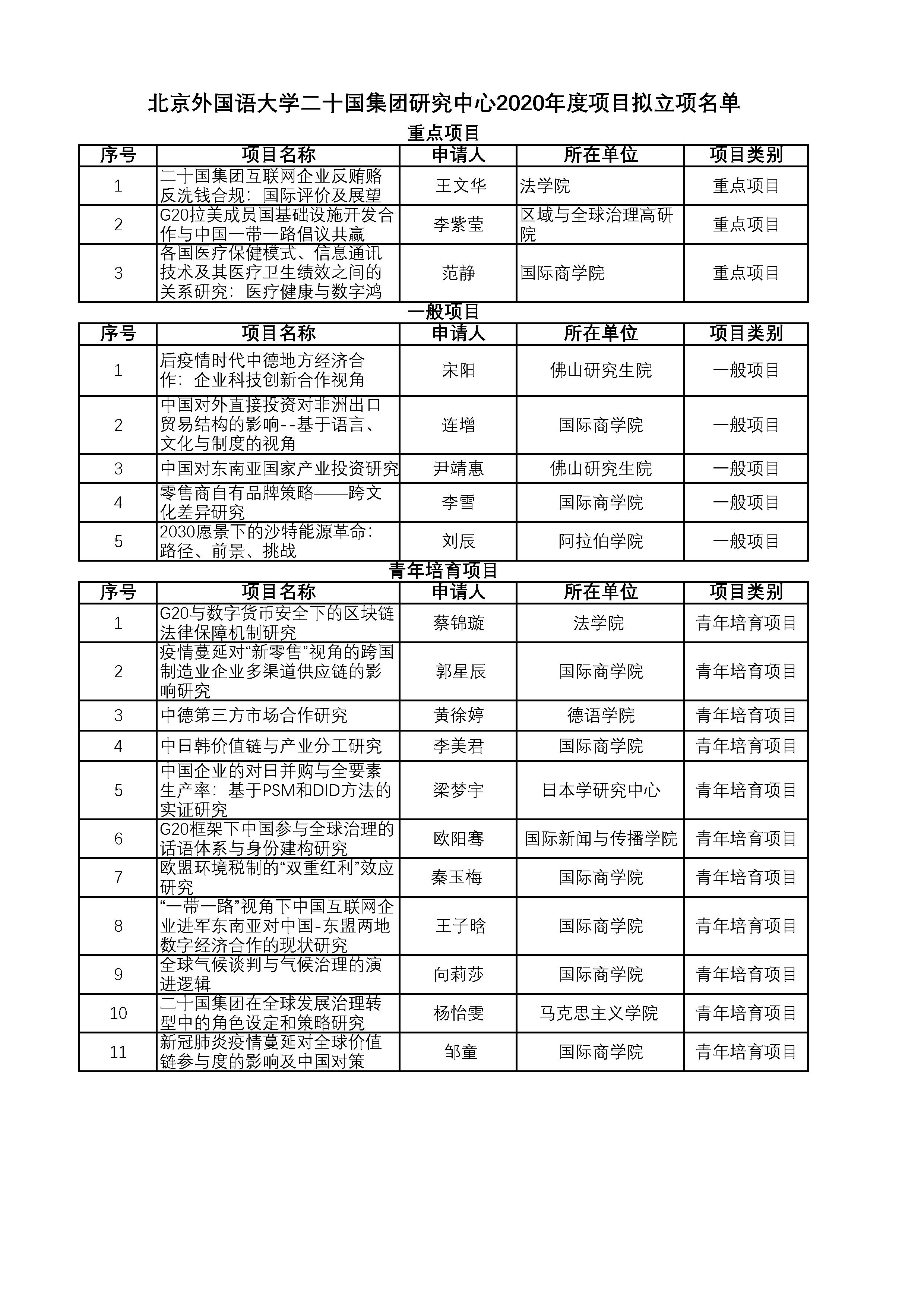 经过自主申报、专家评审,现对北京外国语大学二十国集团研究中心2020项目拟立项名单进行公示,公示期2020年6月22日-2020年6月28日。公示期内,如有异议,请以书面方式向北京外国语大学二十国集团研究中心反映,并提供必要的证据材料,以便核实查证。提出异议者须提供本人真实姓名、联系电话等有效联系方式。