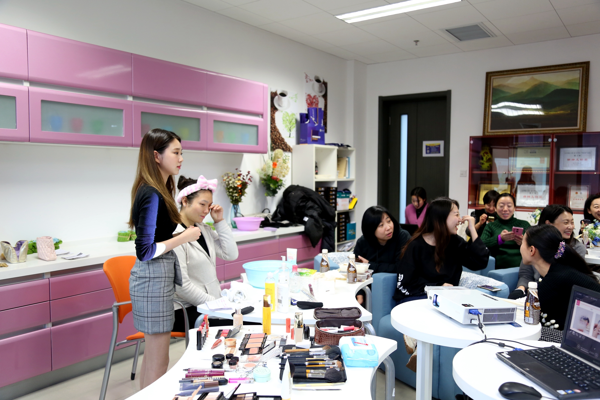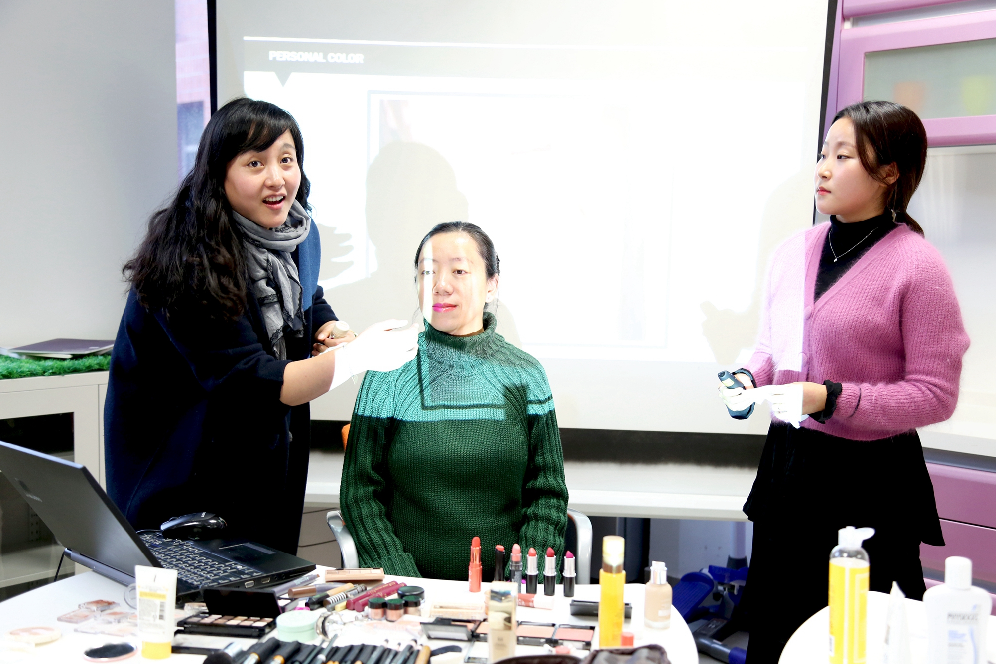 活动中,授课学生根据韩国专业教学的经验,为不同肤质的教师提供了不同的美容和化妆方案,并在发型设计和服装搭配中提供了多种选择方案,此次活动不仅提供了多重审美视角,也提升了教师化妆技巧,更加增进了学生和教师之间的互动。