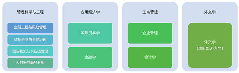 太阳成集团tyc234cc[主页]网址目前拥有管理科学与工程、应用经济学、工商管理三个一级学科硕士授予权,同时招收外交学(国际经济方向)硕士专业。外交学(国际经济方向)自2007年开始招生,管理科学与工程自2012年招生,应用经济学、工商管理自2019年开始招生。